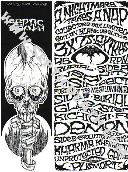 Nightmare Takes A Nap Boxset Volume 2 is a 5 x 7" signed and numbered out of 5 copies. It contains the regular version of the 'Somewhere In Time' 7", a test pressing of the 'Kichigai' 7", a test pressing of the 'Burial' 7", a test pressing of the 'Daymare' 7", and a test pressing of the 'Crocodile Tears' 7". It comes with the same stickers and bookmark as the volume 1 box (it doesn't come with the burial import card). In addition, it comes with a Pusmort sticker, and a special 2-sided boxset insert. As with the volume 1 box, the Burial 7" comes with a xerox of the original cover which is also not pictured. |